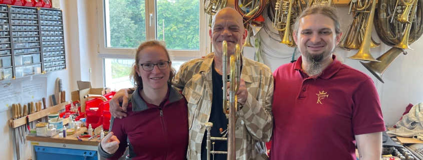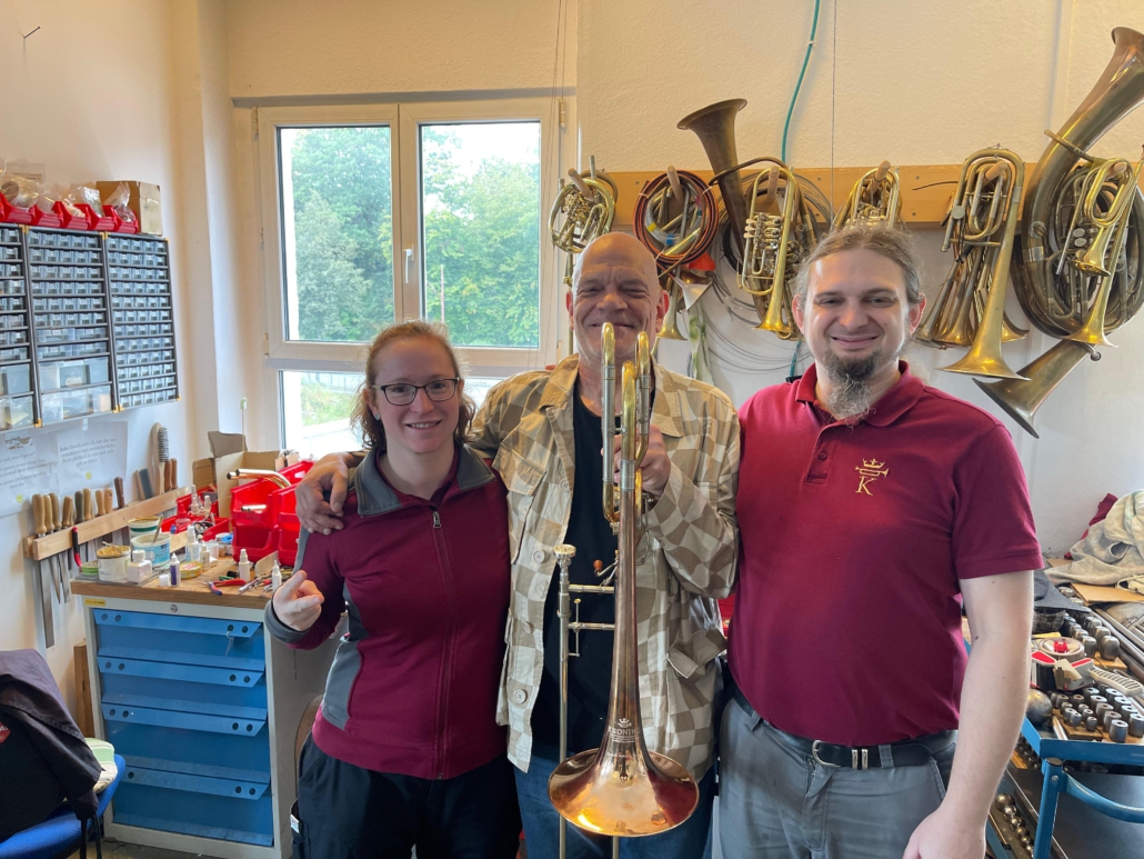 Ashley hatte ab und zu Bassposaunenpassagen auf seiner Jazzposaune gespielt und elektronisch eine Oktave nach unten gesetzt. Der Sound hat ihm und auch uns sehr gut gefallen, aber er wollte auch für Live-Auftritte eine Bassposaune haben, die sehr kernig und zentriert klingt, ohne in der tiefen Lage schwer anzusprechen und ohne Luftstau zu produzieren. Er spielt nun auf dem Prototypen und ist begeistert!